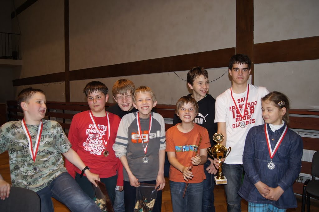 Nasza druga drużyna zajęła szóste miejsce: Zagrali Szymon Beczała (1,5/7pkt ruz: 1500) Bartek Chmura (1/7pkt ruz: 1425), Wojtek Chmura (4/7pkt, ruz: 1600) oraz również gościnnie najmłodsza uczestniczka turnieju Kinga Zelek (1,5/7 pkt ruz: 1225).